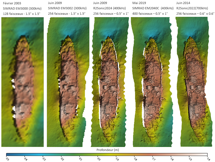Cependant, la proximité géographique de l’épave avec le laboratoire de recherche d’ENSTA Bretagne en a fait une zone d’étude privilégiée. Les chercheurs peuvent suivre son évolution dans le temps en faisant régulièrement des mesures de la bathymétrie, c’est-à-dire de la topographie des fonds marins sur le Cobetas. En plus de la surveillance de l’épave, les données des différents capteurs analysées au cours des années traduisent les avancées technologiques en matière de résolution et de précision de la bathymétrie de la zone, mais aussi d’automatisation de leur traitement et de leur analyse.
